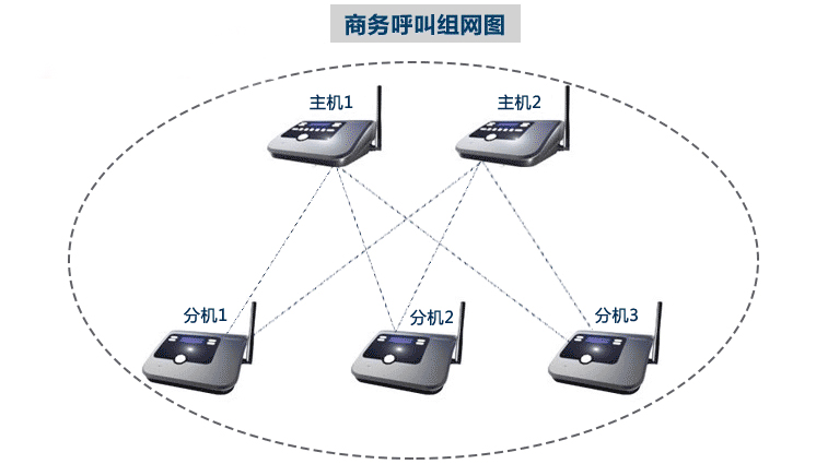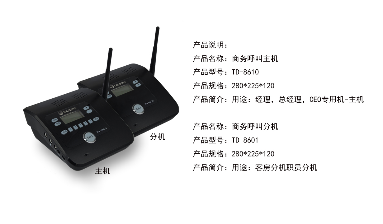 1)、使用商務(wù)呼實現(xiàn)一對一、一對多、多對一、多對多呼叫:一個或多個老板呼叫一個或多個秘書或助理,每個老板一臺主機,每個秘書一臺接收分機;每套系統(tǒng)有一個或多個主機和多個接收分機,主機和分機都顯示自己的號碼,主機可以通話快捷鍵A,B,C,D,E選擇分機的號碼(可提前存入),選好分機號后,當(dāng)按下主機CALL按鍵時,主機會發(fā)出信號,相應(yīng)分機接收到指令后發(fā)出鈴聲(本機提供五種鈴聲選擇,第一種自動接通),分機按下CALL鍵可以立即與主機雙向通話,這時按音量加減鍵可調(diào)聲音大小,如要結(jié)束通話時再按一下CALL鍵,即停止通話。
