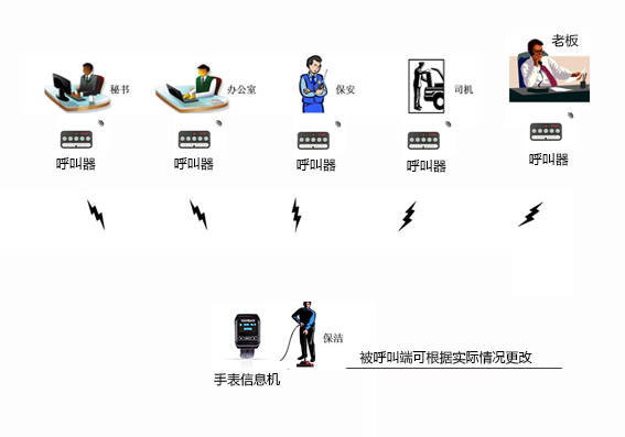 每個老板配一個手持呼叫器,移動接收主機安裝在呼叫器的呼叫范圍內(nèi),每個秘書或助理分配一個手腕信息機;