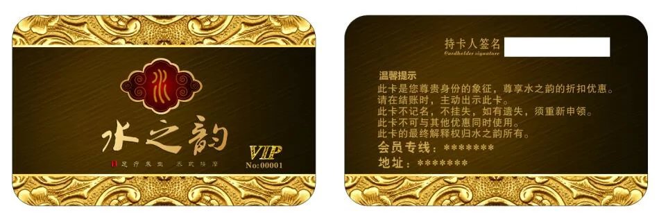 VIP卡是通過卡背面細(xì)則規(guī)定貴賓享有的服務(wù)??梢愿鶕?jù)客戶提供的素材進(jìn)行版面設(shè)計,也可由客戶提供設(shè)計稿,其厚度從0.35mm到0.76mm,也可以做成其它的厚度。標(biāo)準(zhǔn)大小是85.5mm * 54mm,圓角,也可以做成其它尺寸。