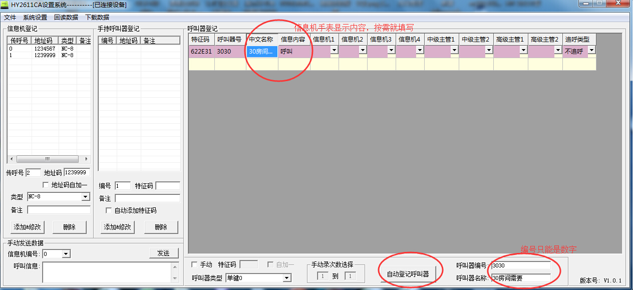 B.呼叫器名稱對應(yīng)中文名稱,信息內(nèi)容就是傳遞到信息機(jī)手表里的內(nèi)容(可以根據(jù)需要填寫)