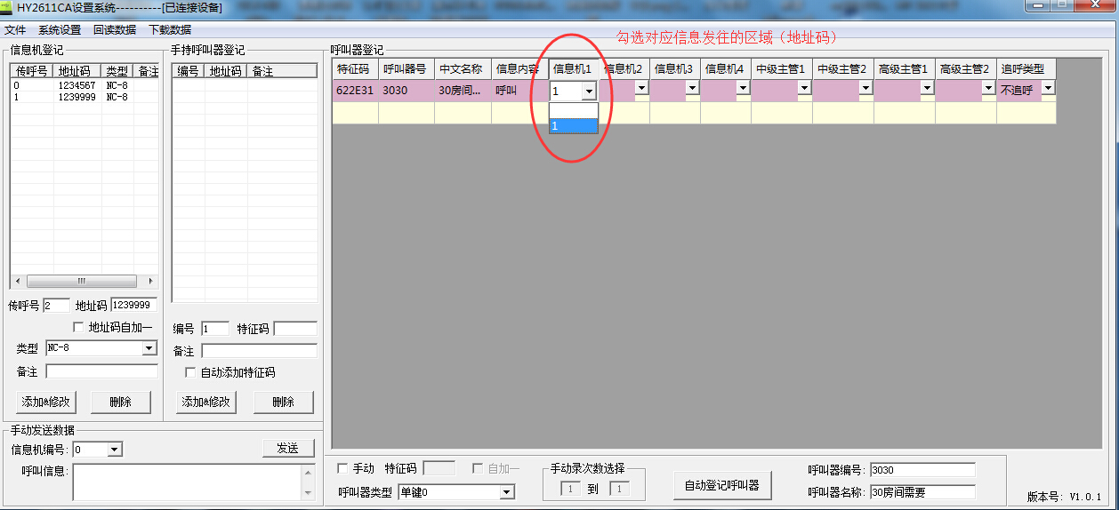 5.勾選要把信息發(fā)布到的信息機(jī)手機(jī)里面,(信息機(jī)1 里的數(shù)字對應(yīng)傳呼號)