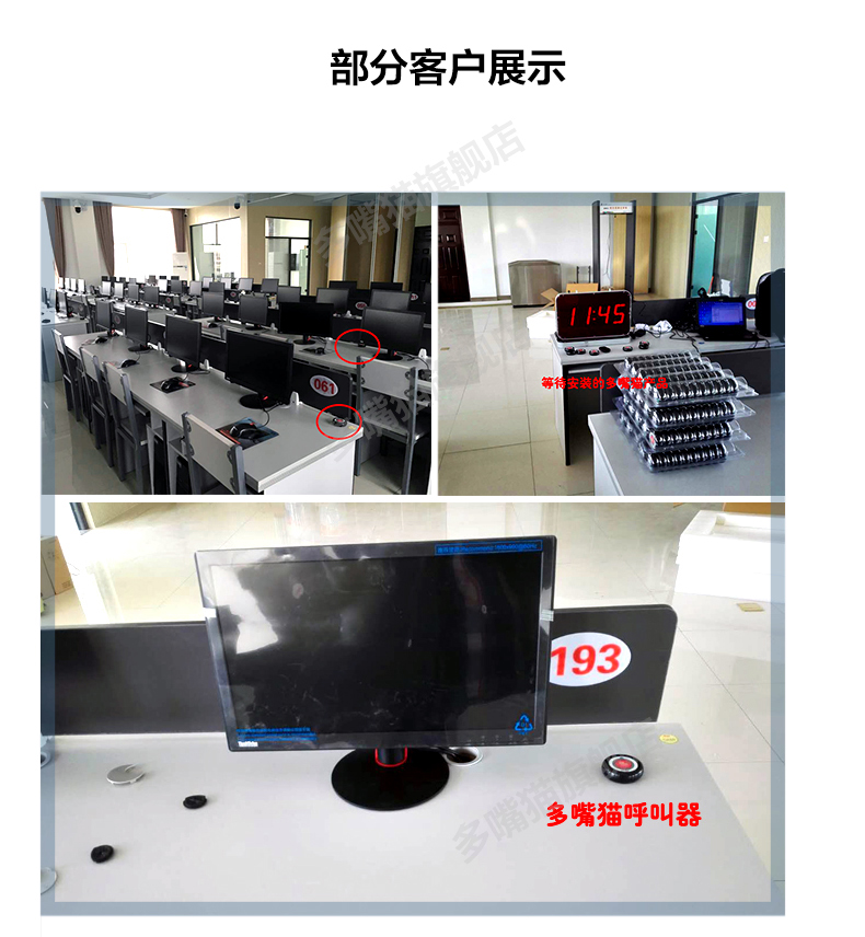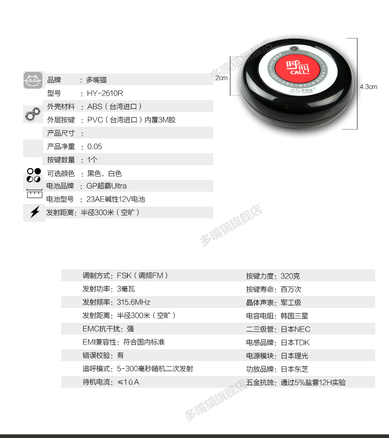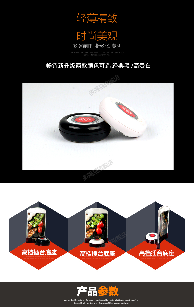 多嘴貓白色圓形呼叫器,2011年推出。調(diào)頻技術(shù)、性能穩(wěn)定、持久耐用。表面拋光、3M背膠PVC按鍵膜、百萬(wàn)次按鍵、可配精美底座。