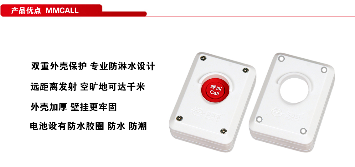 雙層外殼,密封防水,硅膠按鍵,壁掛式調(diào)頻無線呼叫器!多嘴貓工程呼叫器是一款防水、防震、防砸的單鍵無線呼叫器,可固定于墻面,常用于系統(tǒng)工程配套。