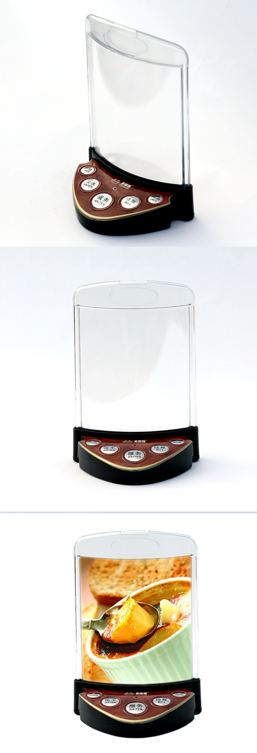 無線呼叫器,采用全新模具工藝,面膜和按鍵與模具一體成型,銀色按鍵,金色裝飾邊,金絲桃木裝飾面板,設(shè)計(jì)風(fēng)格和按鍵文字適合餐飲和服務(wù)場(chǎng)所。