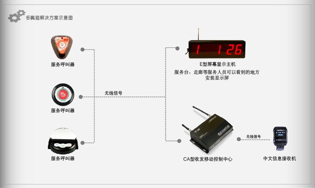 在每個(gè)座位上(或者分區(qū)域定點(diǎn))安裝多嘴貓無線呼叫器,客人在休閑娛樂過程中,可以通過按多嘴貓呼叫服務(wù)員。呼叫信號(hào)通過CA型控制中心發(fā)送至前臺(tái)或者服務(wù)員隨身佩戴的中文手表接收機(jī),服務(wù)員通過中文信息機(jī)上顯示的座位號(hào)碼,為客人提供服務(wù)。多嘴貓更配有兩鍵、三鍵或者五鍵呼叫器,按鍵可以自定義呼叫服務(wù)員、前臺(tái)或者餐品服務(wù)等。