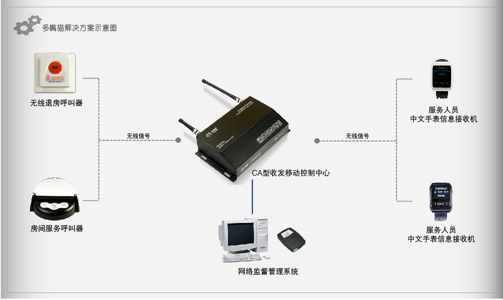 多嘴貓酒店內(nèi)部無線呼叫系統(tǒng)是一套集客房無線呼叫、酒店快速退房等功能為一體的專業(yè)解決方案??头?jī)?nèi)部無線呼叫采用調(diào)頻無線設(shè)計(jì),性能穩(wěn)定,安裝方便,客人在需要服務(wù)的情況下只需輕輕按一下固定在墻壁上的呼叫按鈕即可,樓層服務(wù)員和值班經(jīng)理可同時(shí)收到呼叫信息(隨身攜帶數(shù)字信息機(jī))。酒店不但可以為客人提供高檔、舒適的住宿環(huán)境,還能讓客人住得安全、放心。