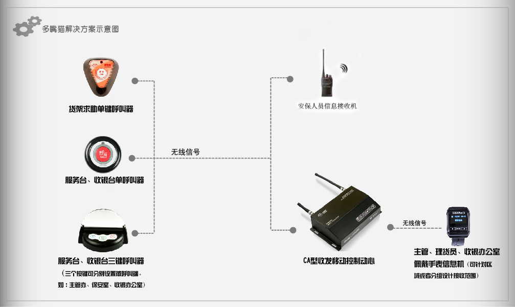 多嘴貓超市無線呼叫系統(tǒng)是一套提高超市內部工作效率和服務水平的超值無線通訊系統(tǒng)。實現(xiàn)高效率,高素質的服務機制;增加競爭優(yōu)勢,增加銷售額;無線找人,各部門實現(xiàn)快速人員調度;減少客人等待時間,提高服務形象;緊急情況快速響應,有效應對突發(fā)事件;無線呼叫器作為一種無線發(fā)射裝置,其頻率與超市的設備無沖突,不影響其他設備的正常使用。在超市呼叫設備必不可少,沒有找到無線設備情況下,部分超市采用了有線設備。